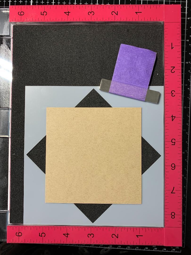 The two stamp sets that I will be using for the shadow technique are Wreath Builder and Autumn Wreath Builder. I am also using the Wreath Builder Templates, I will be using the 4" square template. Using my MISTI stamp positioner, I fit the wreath builder template into the lower right corner of my MISTI and hold it down using the bar magnet. I cut a 4" x 4" piece of Gina K. Designs Kraft cardstock and place it into the template.
