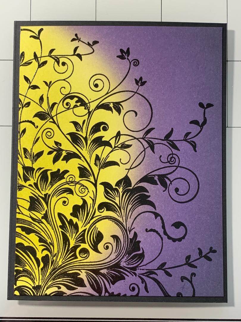 I dry my panel completely by using my Ranger Craft Tool. (you could also use your heat embossing tool) Next, I lay the blended panel into my MISTI stamp platform (I like to add a little dot runner tape to the back of my panel to keep it from moving) and prep with an Anti Static powder bag. Using the Leafy Vine (cling rubber) background stamp, Leafy Vine (if you prefer wood mount), I position it over my panel then pick up with the door of my MISTI. I ink up the stamp using Versamark ink and stamp onto my panel. I then add Black Embossing Powder and heat set with my Heat Tool. Next, I mount my panel onto a 4 1/4" x 5 1/2" Black card base using Double Sided Tape.