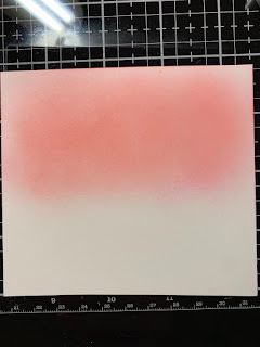 To start, I cut a 4 1/4" x 5 1/2" panel out of Neenah White Cardstock using my Tim Holtz Guillotine Paper Trimmer. I then take my Blender Brushes and blend Spun Sugar Distress Oxide Ink onto the center area of the panel fading in towards the center leaving a highlighted area. Next, I take Worn Lipstick Distress Oxide Ink and blend around the rest of the panel fading into the previous color. To complete my blending, I go back with Spun Sugar Distress Oxide Ink to soften where the two colors meet.