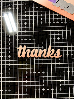 Next, I place a piece of Kraft Cardstock into my MISTI Stamp Positioner and choose a sentiment from the Million Thanks Stamp Set. Using Versafine Clair Nocturn Ink I stamp the sentiment onto the cardstock. I then use my Guillotine Paper Trimmer to cut it down to a thin strip and trim down the ends. I add Double Sided Tape to the back and adhere it onto my card front.