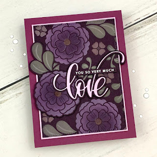 Today I am playing with the brand new layering stencils from Gina K. Designs, called A Little Love Layering Stencils. These stencils are part of a bundle, this bundle also includes stamps and dies that all coordinate together. To be honest, I purchased this bundle all because of the layered "love" die! I absolutely love this die, the font is so beautiful but the best part is the "swoosh"! I love to hang it off the edge of the panel as I did on today's card. This bundle is a great value that is packed with three 6" x 6" layering stencils, stamps that add extra detail to stenciled flowers, small hearts and so many sentiments that all go with the "love" die. There is also a "love" stamp with the same font but is smaller than the die. As if all of this wasn't enough, Gina has included dies that coordinate with images of the stencil so they can also be cut out! I cannot say enough good things about this bundle, I thought I would really only want the die but I ended up loving everything!! These images look beautiful stamped on white or ivory cardstock, but today I wanted to create deep rich colors on a dark background so I went with Edible Eggplant as my base. This post has A LOT of pictures but I wanted to capture each step with these stencils. All of the inks, cardstock and stamps I use today are from Gina K. Designs. Let's get started!!