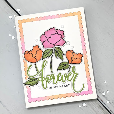 Next, I place my blended panel into my MISTI and lay out all of my die cut pieces to determine my stamp placement. I choose a sentiment from the Forever Flowers Stamp Set and once I have it lined up I remove the die cut pieces and stamp the sentiment with Amalgam Obsidian Black Ink onto my panel. *I let the black ink dry for a few minutes before assembling.