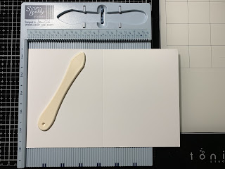 There is another greeting and a couple of sentiments that I want to use on this card. Before assembling my card, I place a 5 1/2" x 8 1/2" piece of White Cardstock into my Scor Buddy and score it at 4 1/4" creating a side folding card base. I then place the card base into my MISTI to stamp some images from the Good Job Mama Stamp Set on the inside. To make sure I have everything lined up straight, I place a Grid Transparency over the inside of my card where I want to stamp. I line up my stamps over the lines then pick the stamps up with the lid of my MISTI and remove the transparency.