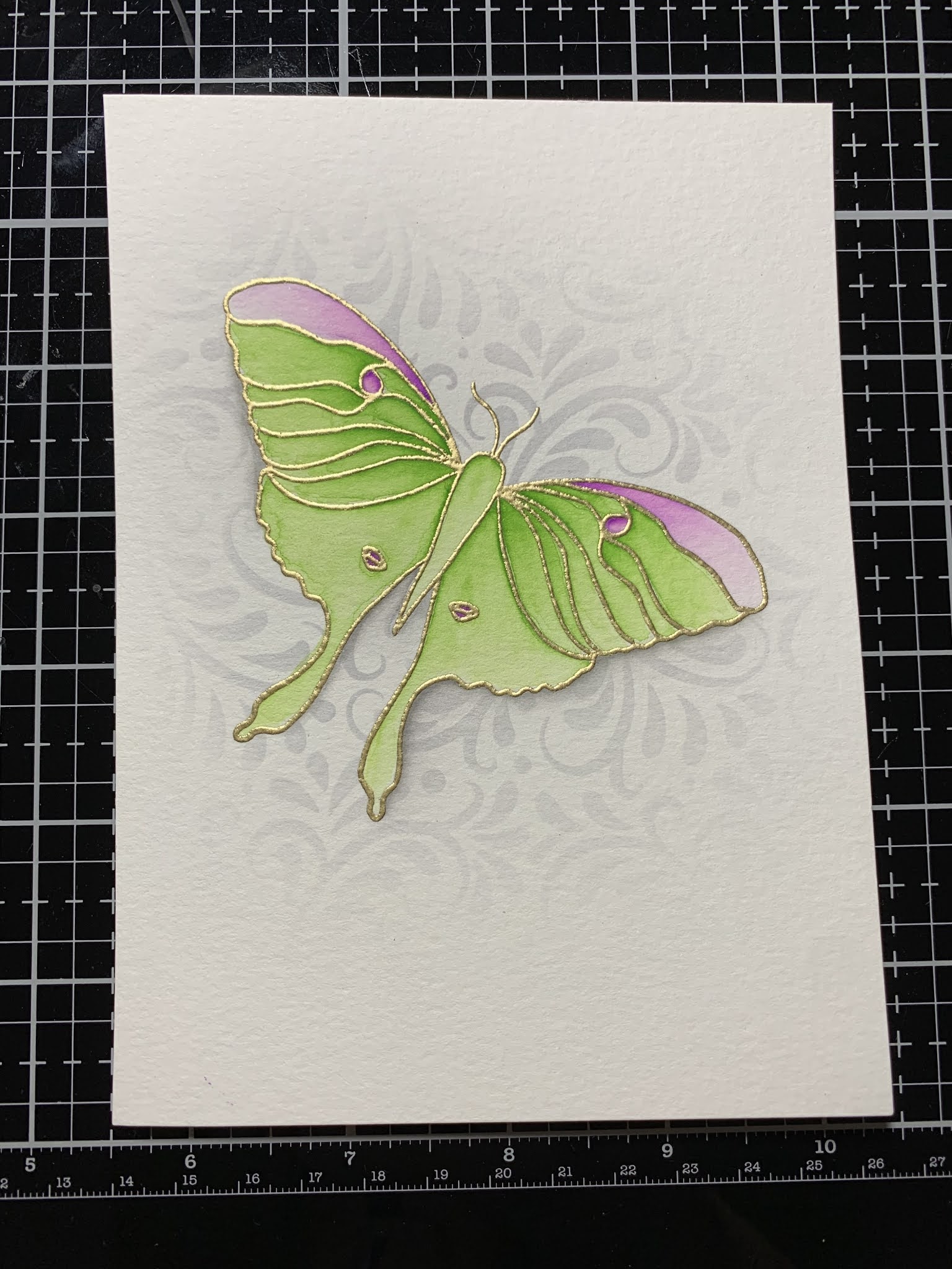 I decided I wanted to add a little something to my card front. There is a beautiful stamp from the set that I thought would be perfect to add as though the moth was leaving a sparkly trail behind. I take the same mask that I created earlier and place it back over my watercolored image. I then place the panel back into my MISTI and prep it with my Anti Static Powder Bag. I line up the star trail stamp from the New Beginnings Stamp Set and place it over the image so that only the lower portion of this stamp makes contact on the panel. I then stamp it with Versamark Ink, add Gold Embossing Powder and heat set with my Heat Tool. I now remove the mask and stick it to the acetate of the stamp set for future use.